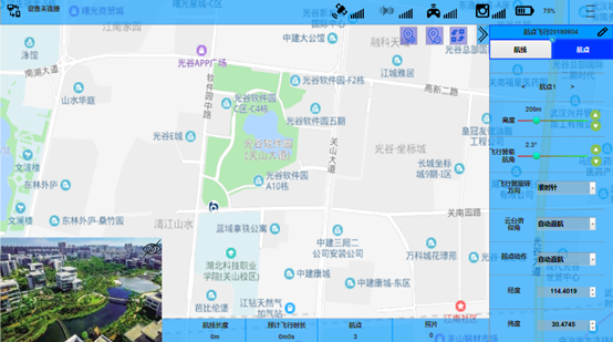 航点规划与PC端飞控软件功能类似,提供点击地图设置航点的功能,航点设置完毕后可以将航点(航线)信息同步到PC端,App端航点规划将会显示设备连接状态、GPS信号、视觉系统、遥控器信号、图传信号、电池电量等信息,下方会显示航线长度、预计飞行时长、航点及图片数量信息。