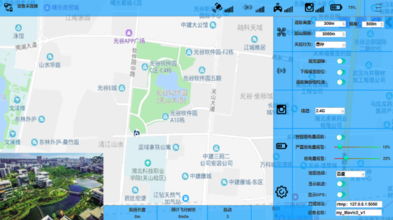 无人机在飞行过程中可以通过飞控软件进行监视和人为干预无人机、云台和照相机的行为,一款无人机飞控软件可以同时连接多架无人机,并可以在界面上看到多架无人机在地图中的位置信息及无人机传回的可见光视频直播。