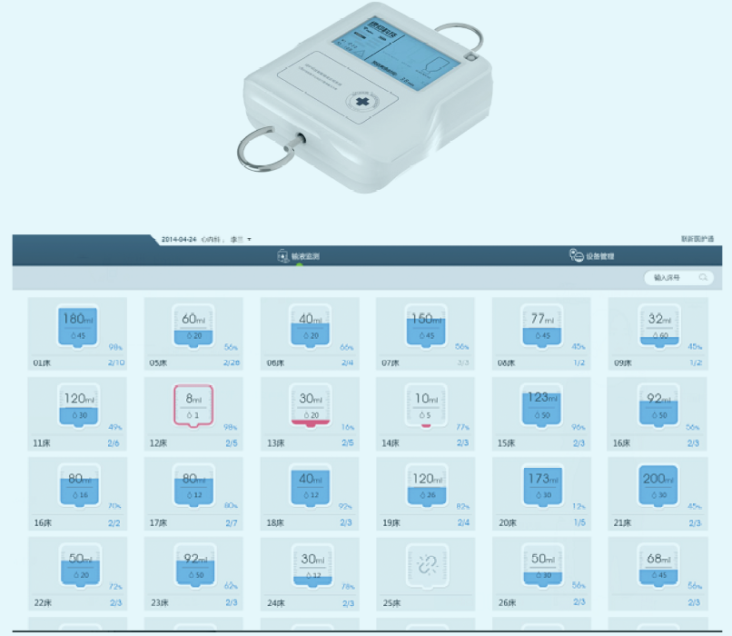 4、输液监控管理系统:系统在不改变原有输液模式下,通过重力传感器,对输液器中的液面进行检测,液位低于设定值时,护士站发出报警,使病人安心治疗,并减轻医护人员工作强度。