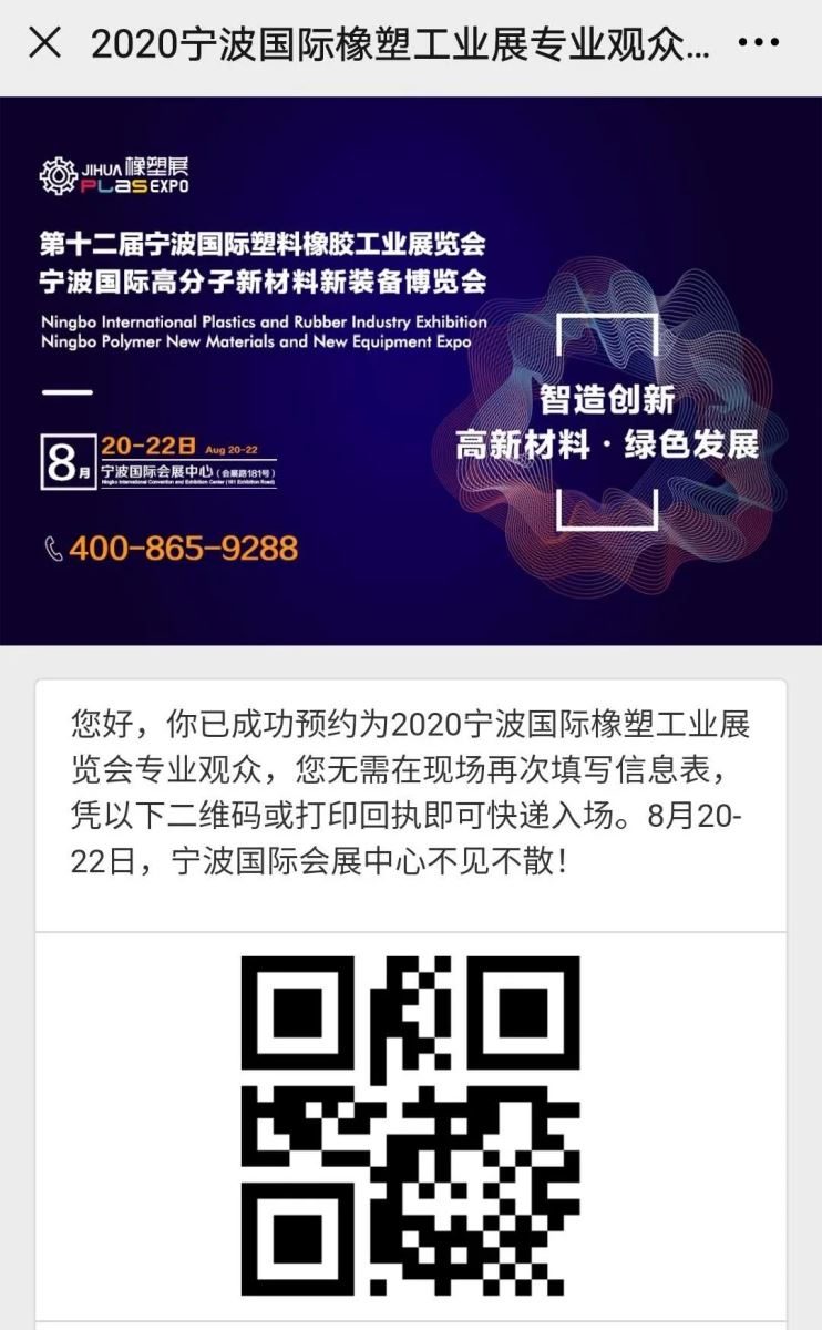 提交信息后即可成功完成参观登记,参观展会需出示本人身份证+参观确认码+甬行码(绿码),至展会现场换取胸卡后入场。