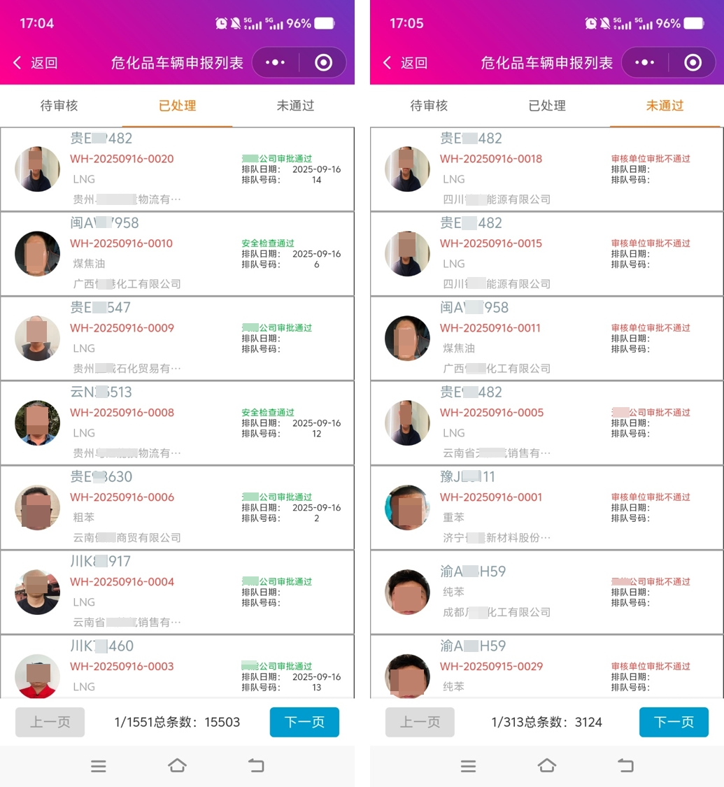 客户单位管理人员拥有审核权限,可通过电脑端或微信小程序查看、审批司机提交的材料,司机通过微信小程序实时查看审核状态,接收驳回原因与补交提醒。通过电脑端与微信小程序的协同,构建“司机便捷提交—管理人员高效审核—状态实时同步”的闭环流程,兼顾安全性与易用性,提升厂内人员审核效率。