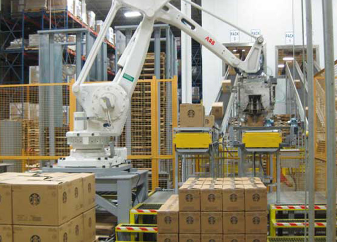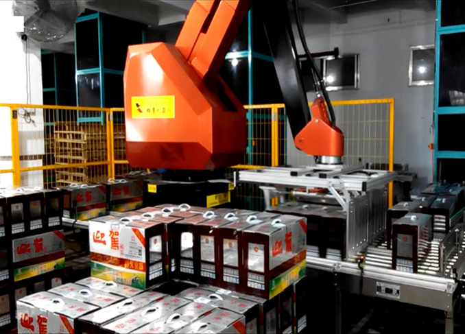 智能箱码垛系统是将装入纸箱的物料或者是经过包装和未经包装的规则物品,按一定排列码放在托盘(木质)上,进行自动堆码,可堆码多层,然后推出,便于继续进行下一步包装或者叉车运至仓库储存。码垛机实现智能化操作管理,可大大地减少劳动人员和降低劳动强度。