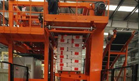 高位码垛机将料袋输送至一定高度后,按照预定方式对料袋进行转位、编组、推袋、分层、码放,将料袋按层码放到托盘上,最后将码好的满垛输出。